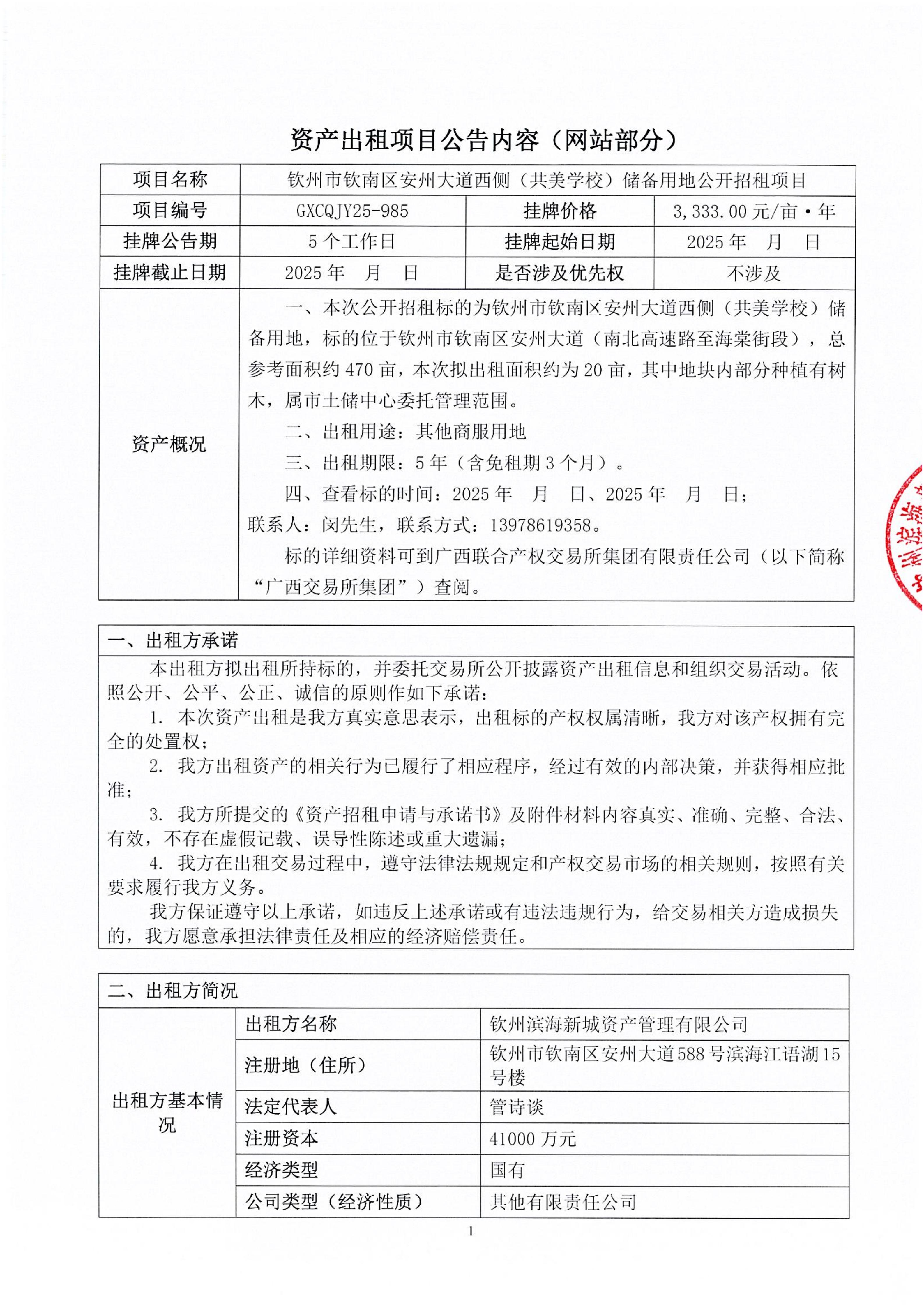 欽州市欽南區(qū)安州大道西側(cè)(共美學校)儲備用地公開招租項目