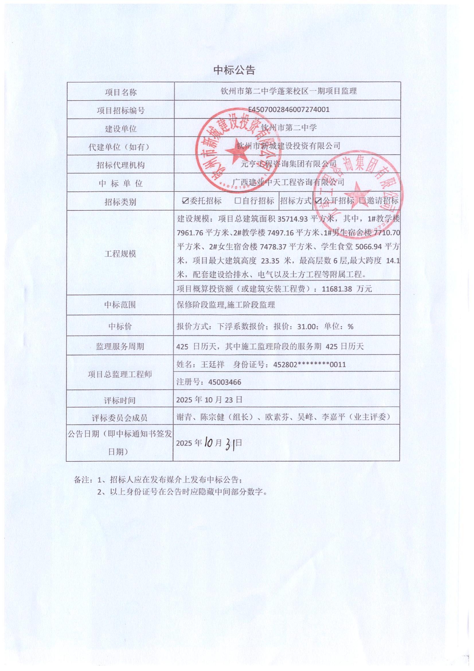 中標(biāo)公告(欽州市第二中學(xué)蓬萊校區(qū)一期項(xiàng)目監(jiān)理)
