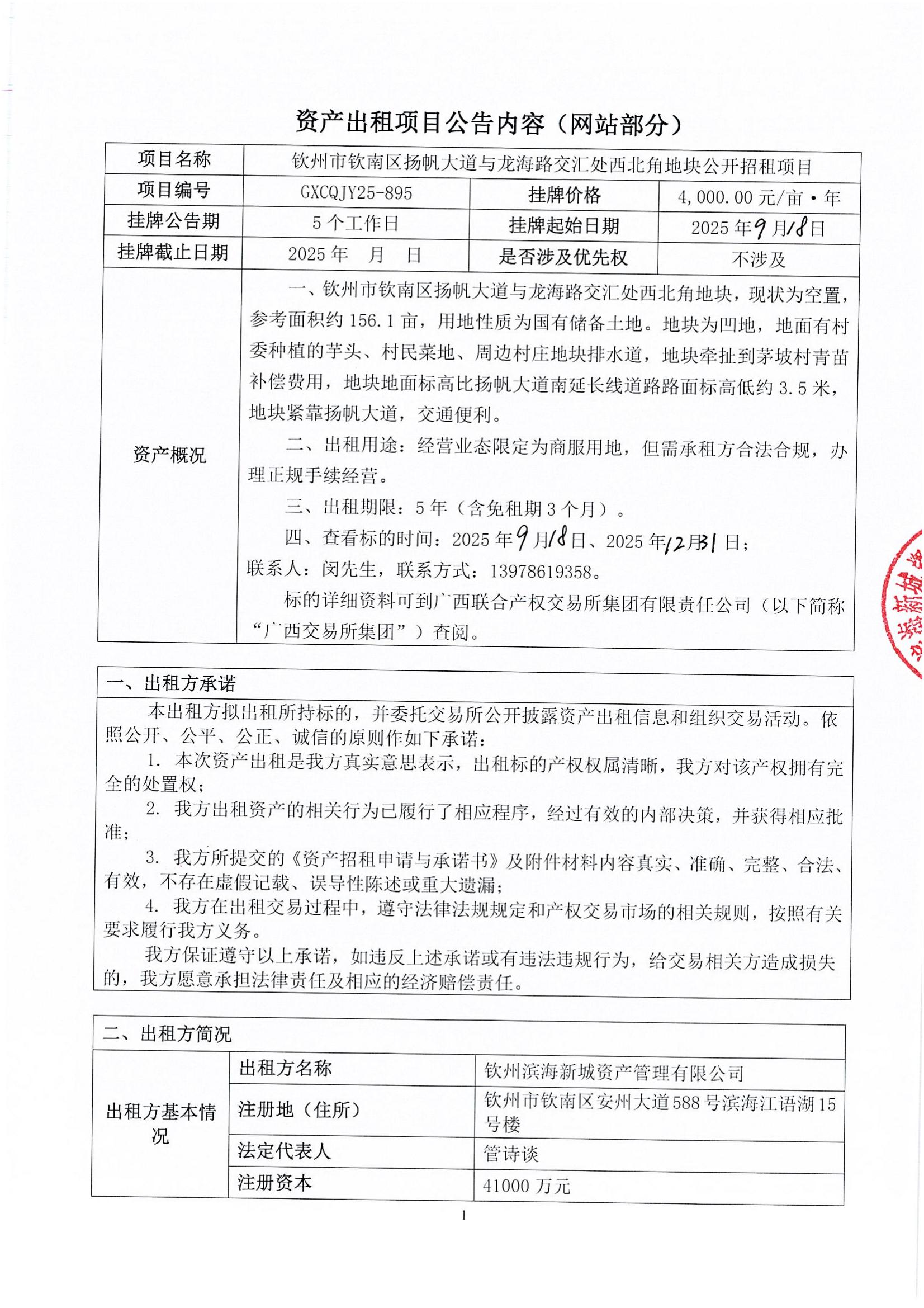 欽州市欽南區(qū)揚帆大道與龍海路交匯處西北角地塊公開招租項目