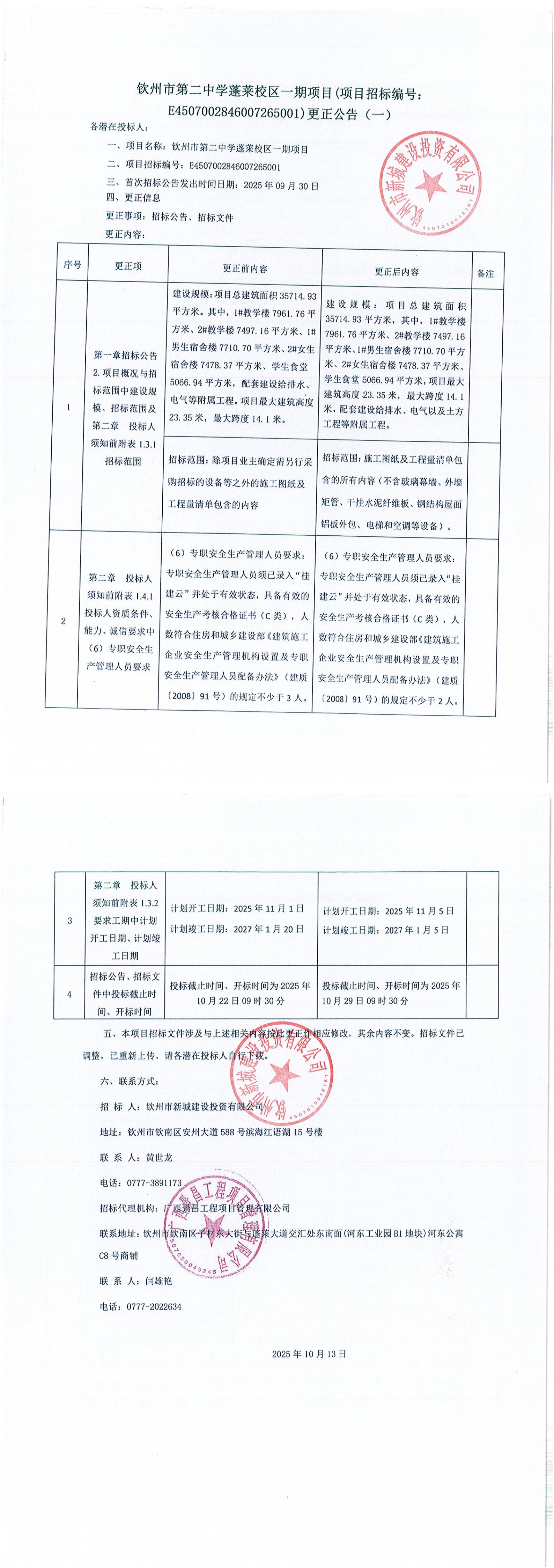 欽州市第二中學蓬萊校區(qū)一期項目(項目招標編號:E4507002846007265001)更正公告(一)